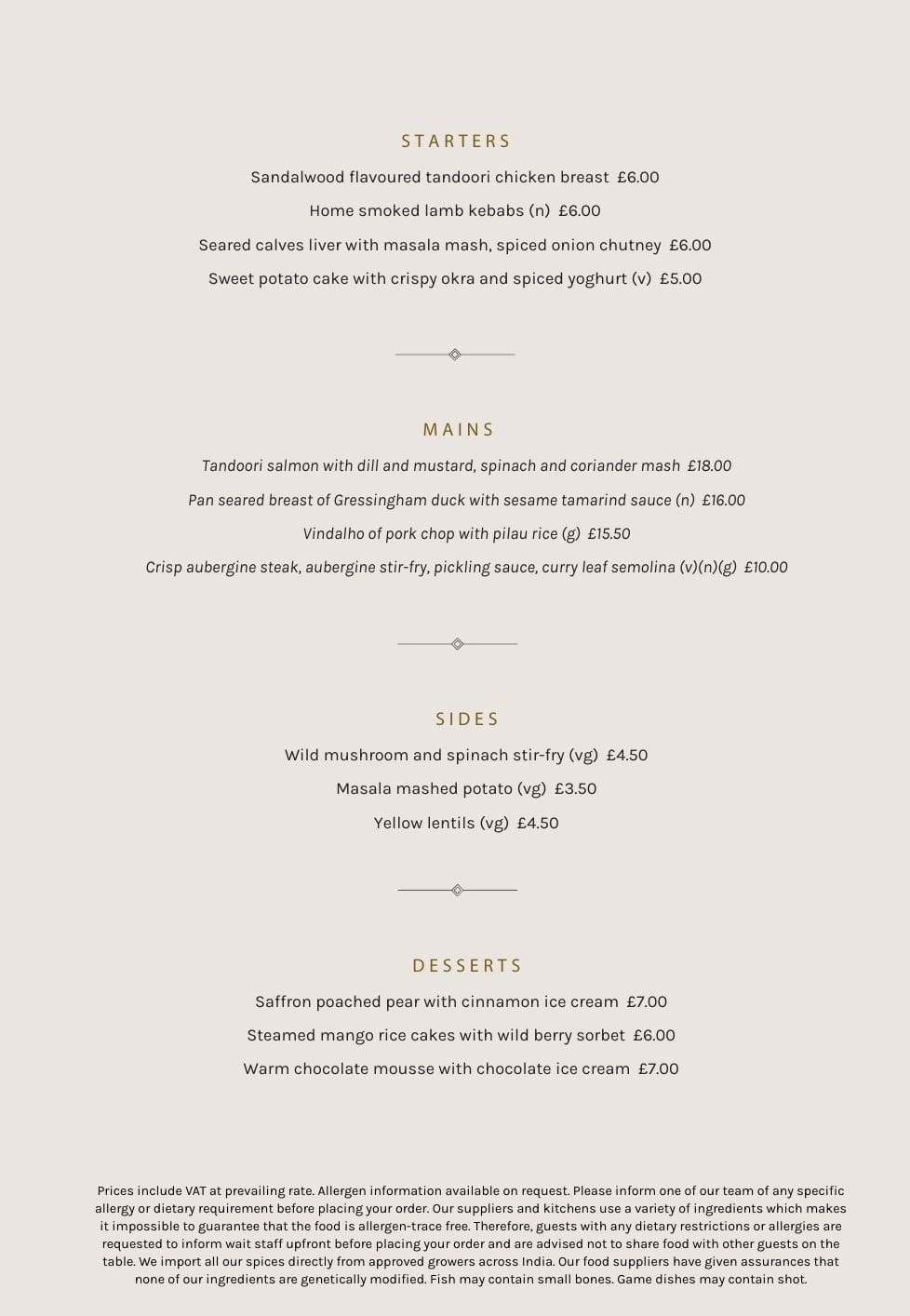 Our long-established take on game classics and delicately-spiced fish remain, along with signature dishes, tasting menus with seasonal options and celebratory sharing dishes, containing ingredients exclusive to us, which are carved and served table-side for between two and six guests.